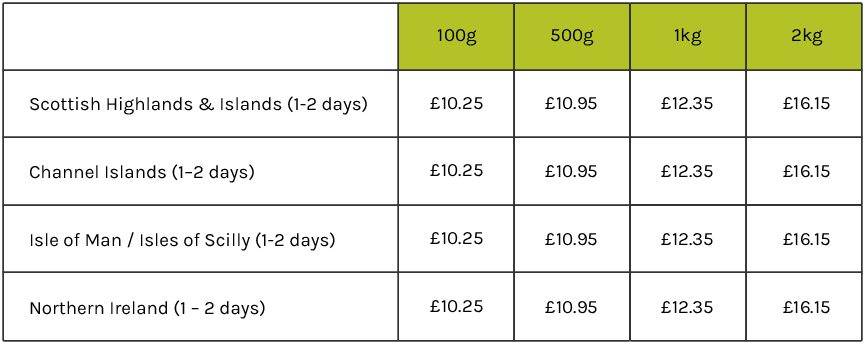 We also offer Royal Mail shipping for orders between 2kg – 10kg for customers in Northern Ireland, Channel Islands, Isle of Man, Isles of Scilly and Scottish Highlands & Islands only.