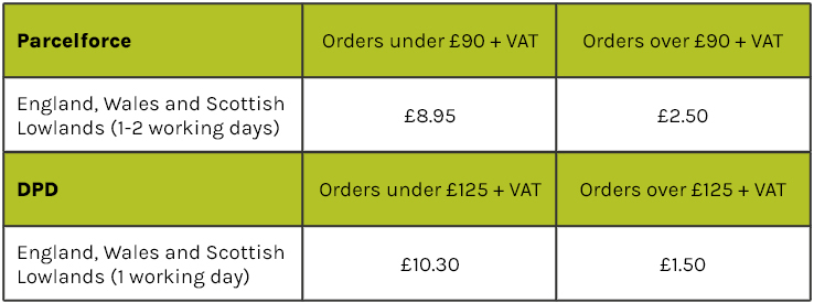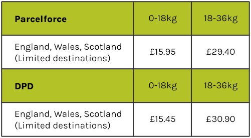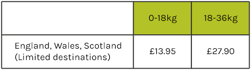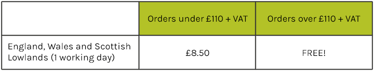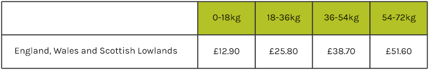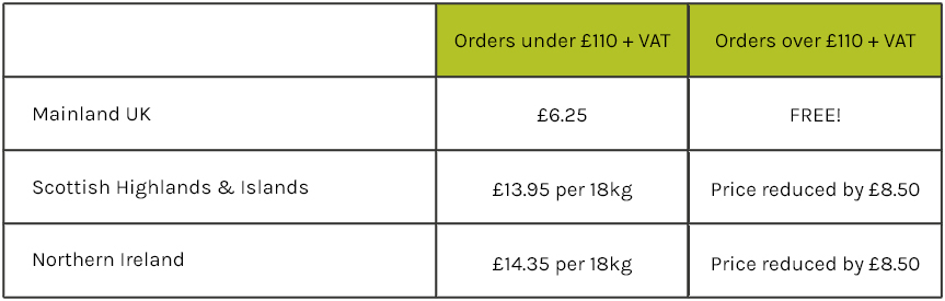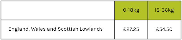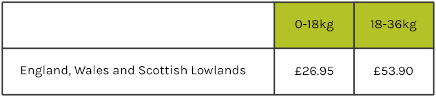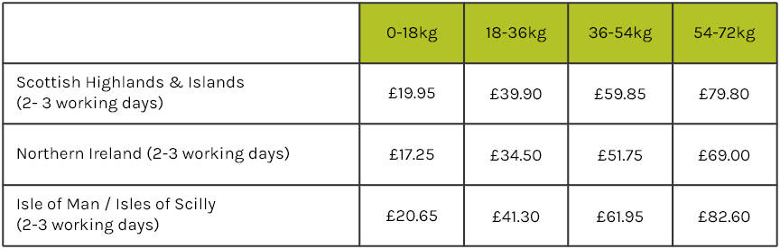 *Reduced delivery charges for Highlands, offshore locations and European destinations. Reduced delivery if weight goes over 18kgs.