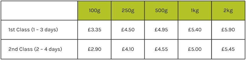 We also offer Royal Mail shipping for orders between 2kg – 10kg for customers in Northern Ireland, Channel Islands, Isle of Man, Isles of Scilly and Scottish Highlands & Islands only.